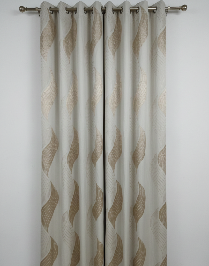 Design & Aesthetics: This curtain showcases a bold, oversized sculptural wave motif. The design utilizes a contrasting play of textures, featuring shimmering champagne-gold waves set against a crisp, matte cream base. The sweeping curves provide a sense of height and organic flow to any room.