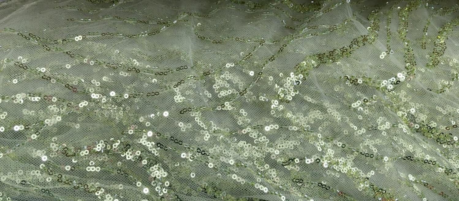 Bring a touch of sophisticated shimmer to your next creation with the Nura Olive Green Lace. This ethereal fabric features a fine, sheer mesh base adorned with delicate, undulating waves of shimmering olive-toned sequins, offering a refined and organic sparkle.