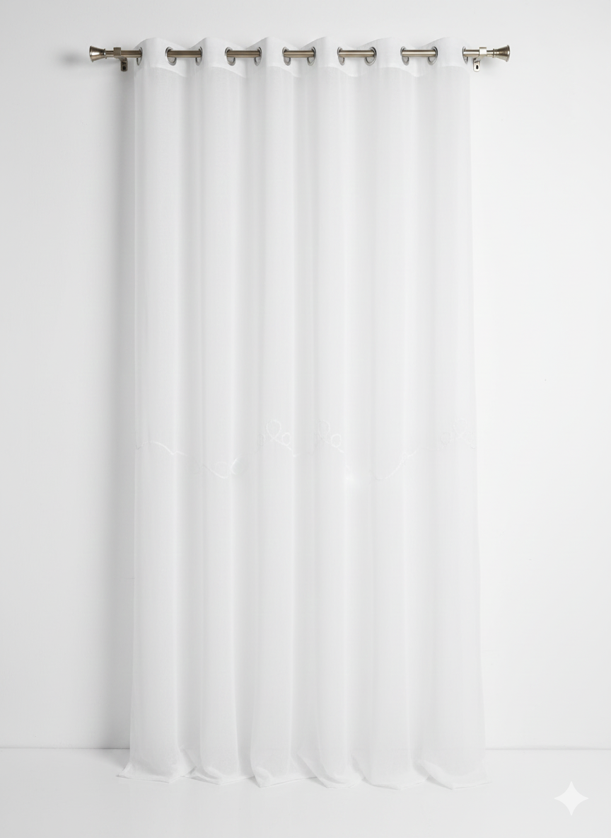 Delicate embroidered lace detailing runs subtly across the curtain, providing a refined decorative accent without overwhelming the clean, minimalist design. The crisp white color reflects light and brightens the room, making it ideal for living rooms, bedrooms, dining areas, offices, and hospitality spaces.