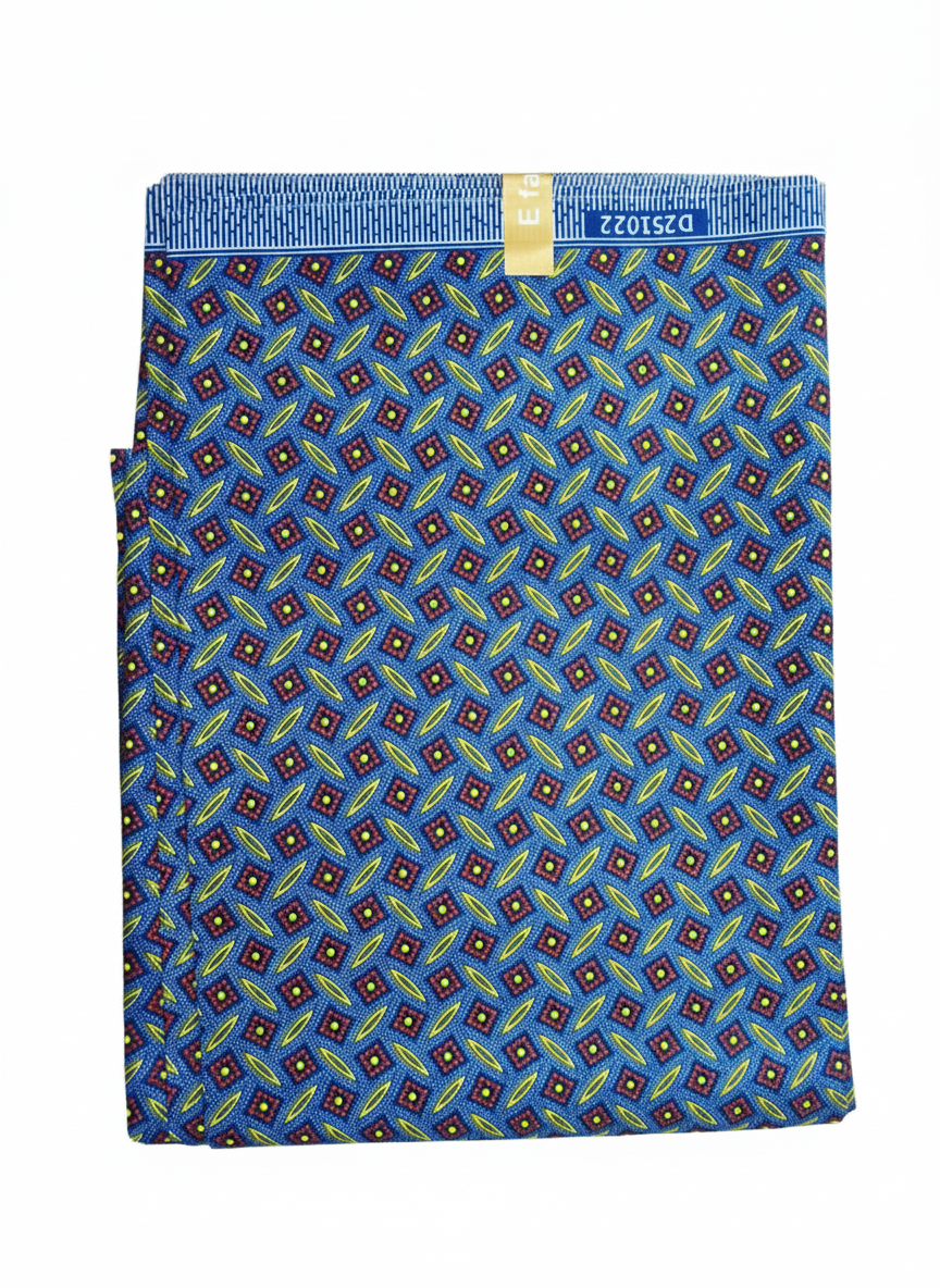 This fabric offers a more modern, structured look. It features a deep blue base intricately patterned with a repeating grid of small, lime-green-centered squares framed in dark red, interspersed with elongated leaf or diamond motifs. It is ideal for tailored shirts, structured jackets, or bold accessories.